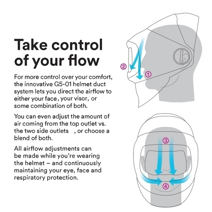 - With the helmet’s new duct system, users can direct the airflow to either their face or visor, as well as the amount of air coming from the top outlet vs. the two side outlets. With greater control over personalized settings, users can balance the airflow’s cooling effect while minimizing flows that might dry out their nose or eyes.