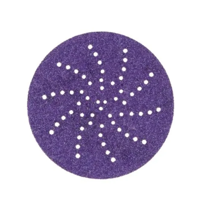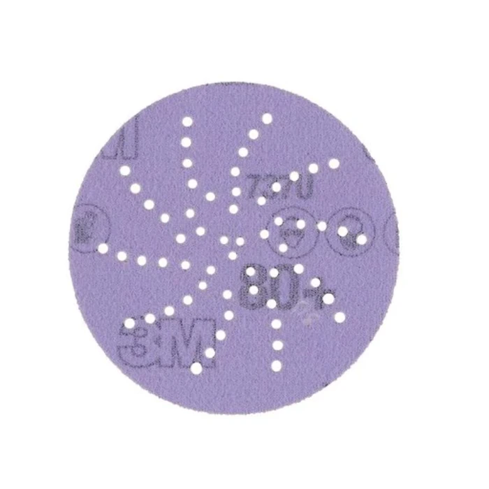 Get a superior cut and durability during key stages of automotive repair with 3M™ Cubitron™ II Hookit™ Purple+ Multihole Abrasive Disc 737U. Our triangular shaped grain and multi-hole pattern abrasive disc is ideal for paint removal, rough body filler shaping, fine feather-edging and final prep before blending or priming.Shape rough body filler, remove paint and create fine feather-edging with 3M™ Cubitron™ II Hookit™ Purple+ Multihole Abrasive Disc 737U. Our triangular shaped grain and multi-hole pattern abrasive disc can also be used for the final prep before blending or priming. It gives a superior cut, 30% faster than other premium abrasives, and long disc life during key stages in auto body repair. The surface of the abrasive disc has our Precision-Shaped Grain technology. It’s made from sharp triangular shaped electrostatically oriented grains. Each grain works as an individual cutting tool to slice through paint and body filler. The multi-hole pattern on our abrasive disc offers excellent dust extraction increasing cut rate and disc life. The back of the abrasive disc has our Hookit™ technology. A hook-and-loop system for work spaces where adhesive backed discs may become spoiled by dust, dirt, or flying debris. Hookit™ sanding discs attach to a hook‐and‐loop backup disc pad (sold separately) on a random orbital sander, can be removed cleanly and easily, and can be re‐used again and again for the extent of the abrasive life.