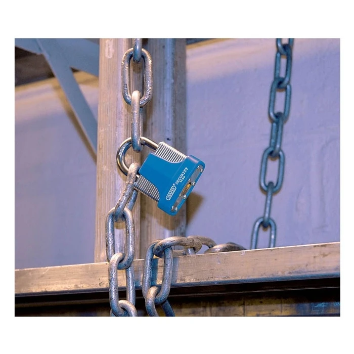 Laminated steel body with hardened, plated coating steel shackle. Brass cylinder & precision pin tumbler. Damage to the locked item is prevented by a bumper. Supplied with 2 keys, key blanks available separately. Display packed.