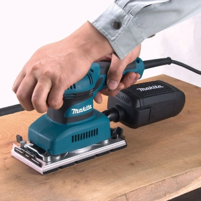 The Makita BO3710 1/3 Sheet Orbital Sander has an ergonomic tool body that fits the user’s hand perfectly, providing sure grip and easy handling whether in a single or double handed operation. The sander has electronic ignition and a powerful motor for a fine finish. The built-in dust collection system keeps the work environment clean and free from debris.