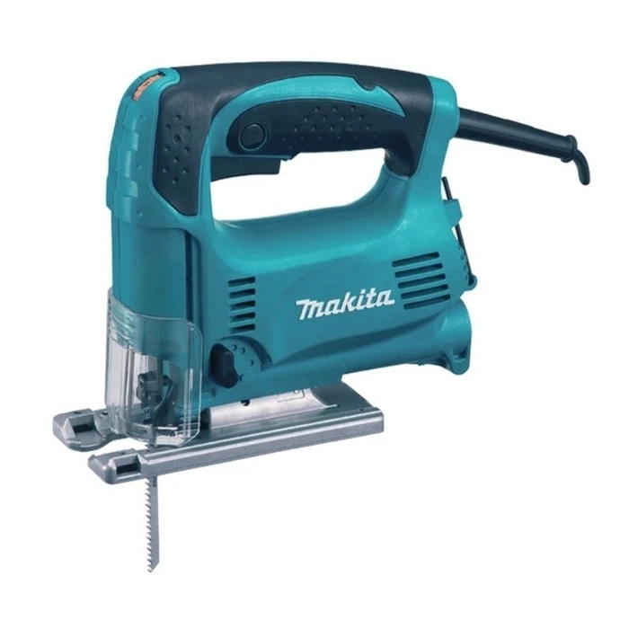 The Makita 4329 Orbital Action Jigsaw has 3 orbit settings and a variable speed trigger. Its smooth, rigid aluminium base is rustproof and easily glides over the workpiece. Bevel cutting up to 45° left or right is also possible with the tiltable base. The ergonomic, lightweight design incorporates a counterweight balancing system which reduces vibration. A sliding dust cover improves dust collection and prevents the scattering of chips.