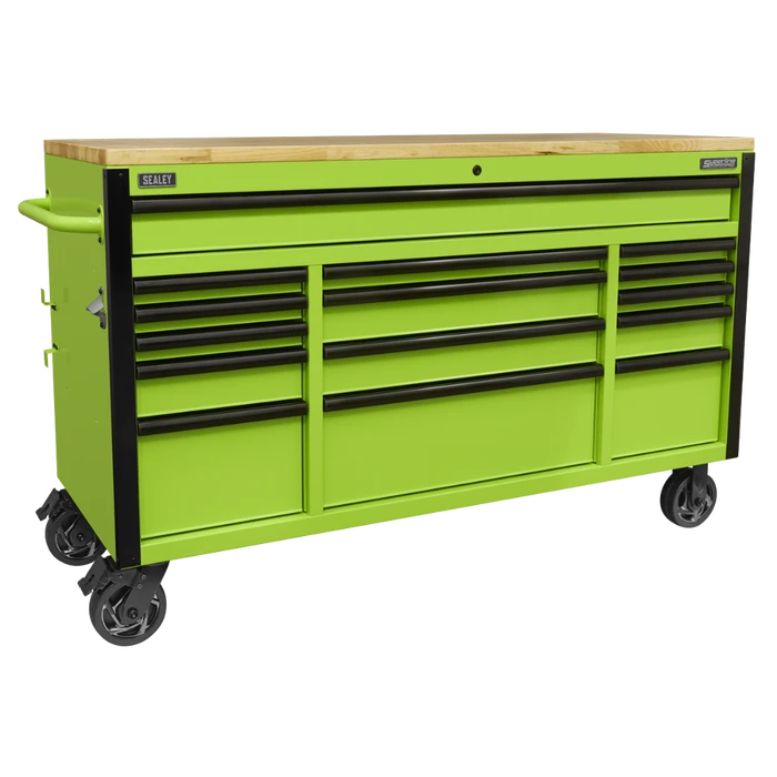 Use as part of a complete garage storage system or as an individual storage trolley. All heavy-duty steel construction and manufactured with steel inner walls for extra strength and durability. 15 Full height rear locking mechanism soft close drawers with heavy-duty 45mm ball-bearing slides that provide superior drawer performance. Tough industrial powder coated finish. Fitted with four Ø152mm PP wheels with black chrome effect alloys, two castors with quick release anti-rotation toe locks and two fixed wheels. Side handle for added comfort when manoeuvring around the workplace and stylish 30mm wooden work top. Each drawer features stylish black anodized drawer pulls plus pre-cut non-slip liners. Features a power cord storage hanger and bottle opener. Supplied with two folding keys. This item is heavy. Extra assistance must be provided at the delivery point to help its safe delivery.