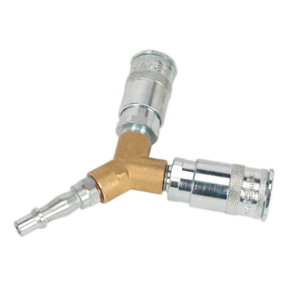 Free airflow rate at 100psi(7bar): 35-43cfm(991-1218L/min). Split air supply into two outlets. Vertex slim coupling bodies offer reduced physical bulk of fitting over traditional Y-couplings. Manufactured in the UK. Slim profile bodies suitable for trailing hose applications such as portable garage and workshop tools. Compatible with standard coupling adaptors.
