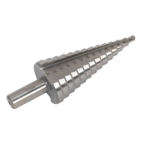 High-speed HSS 4341 double straight flute step drill. Double straight flutes for efficient swarf clearance. Allows clog-free precision drilling. Supplied in plastic storage case.