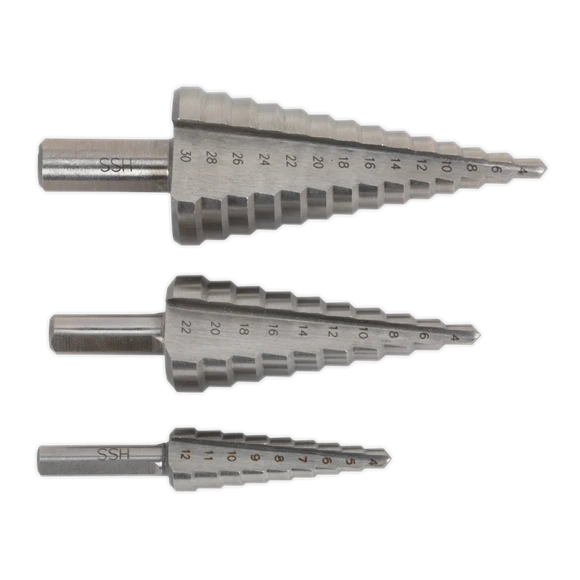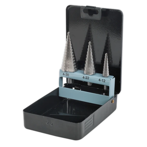 Three high-speed HSS 4341 double flute step drills. Double straight flutes for efficient swarf clearance. 18 Sizes covered by three drill bits. Supplied in flip-up metal case.