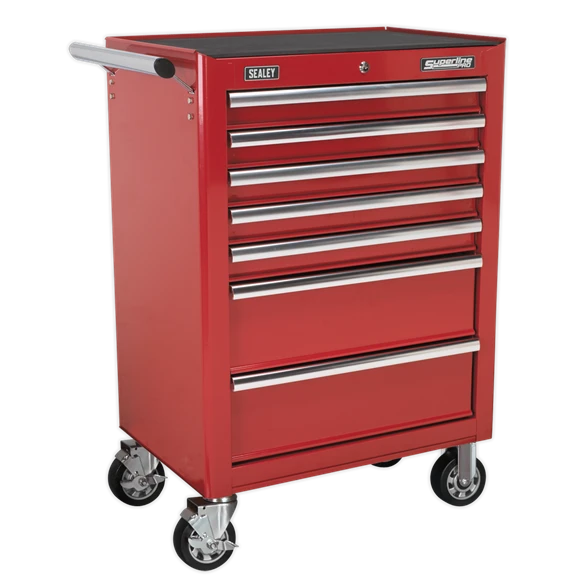 All heavy gauged steel construction and manufactured with steel inner walls for extra strength and durability. Heavy-duty 45mm ball bearing drawer slides provide superior performance and carry heavier loads. Full height rear locking mechanism, locks full-length drawers in multiple locations. Added security provided by cylinder locks. Supplied with two keys. Rust and solvent resistant powder coat paint finish. Includes four extra-heavy-duty Ø125mm PU/PP alloy wheels, two castors with large toe locks and two fixed wheels. Rollcabs feature a high polished chrome handle to enable smooth manoeuvrability. Also includes a 6mm thick top mat. Drawers ideally sized for fitting Sealey themed tool trays. Each drawer features stainless steel drawer pulls and non-slip liners.