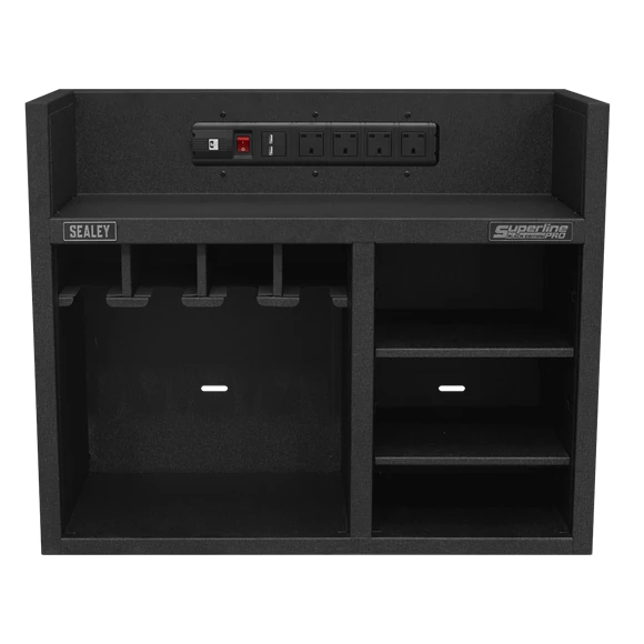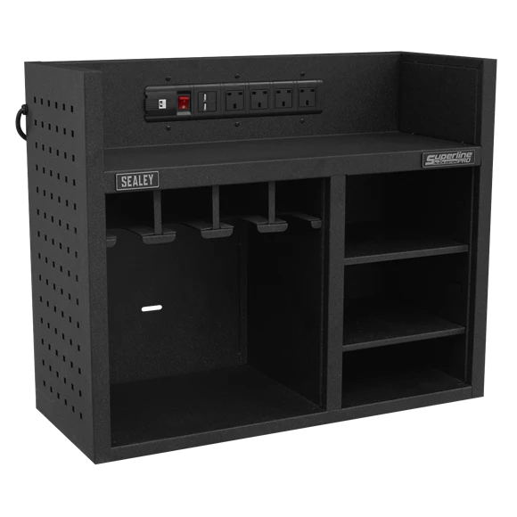 Wall mounting rack specifically designed for the storage of power tools. Stores up to four power tools. Open front bays make power tools easily accessible. Fitted with a power strip (4 x 230V, 2 x 5V 2.4A USB sockets). Side panels made from perforated steel for hook storage. Rust and solvent resistant black crinkle effect paint. Two adjustable storage shelves. 2mm EVA liner for each power tools bay.