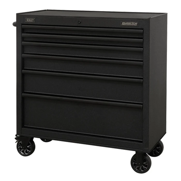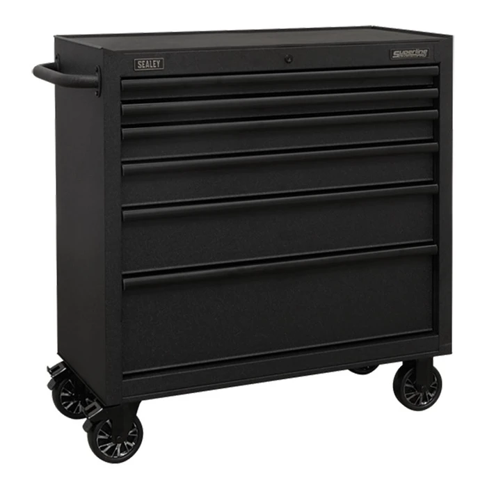 All heavy-duty steel construction and manufactured with steel inner walls for extra strength and durability. Heavy-duty 45mm ball bearing drawer slides provide superior performance, suitable for heavier loads. Full height rear locking mechanism, locks smooth running soft close drawers in place. Rust and solvent resistant black crinkle effect finish. Fitted with four Ø125mm PP wheels with black chrome effect alloys, two castors with quick release anti-rotation toe locks and two fixed wheels. Side handle for added comfort when manoeuvring around the workplace. Each drawer features stylish black anodized heavy-duty drawer pulls plus pre-cut non-slip liners. Supplied with two folding keys.