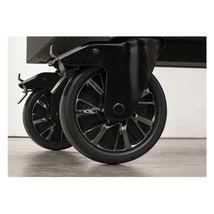 - Fitted with four Ø125mm PP wheels with black chrome effect alloys, two castors with quick release anti-rotation toe locks and two fixed wheels.Â