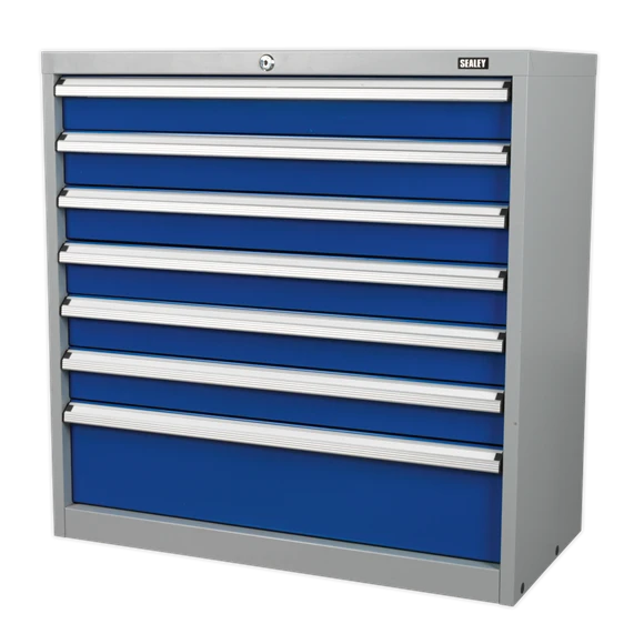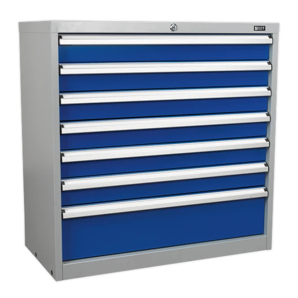 Industrial quality, seven drawer, freestanding cabinet. Drawers run on heavy-duty ball bearing slides with load bearing of up to 75kg and are fitted with safety locking catches. Each drawer is fitted with removable dividers running front to back and then supplied with cross dividers for personalised storage layout. Fitted with high quality lock and two coded keys.