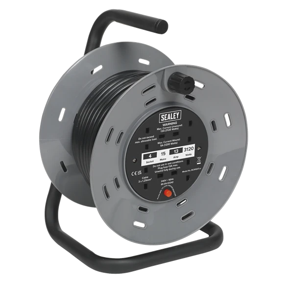 15m x 1.25mm² Three core cable. Four 230V sockets. Durable composite lightweight drum. Fitted with thermal trip. Ideal for DIY, the jobbing craftsman or mobile professional user.