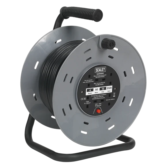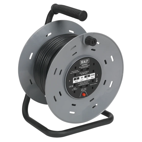 Durable composite drum on steel stand with 4 x 230V sockets. Fitted with 3-pin plug and thermal trip. 50m 3 x 1.25mm² PVC cable.