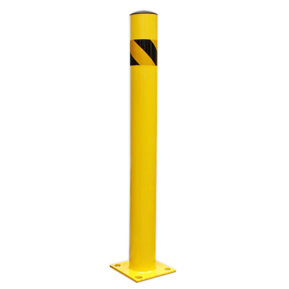 Constructed from heavy-duty Ø110mm steel pipe. Plastic cap can be removed and the pipe filled with cement for greater impact resistance, or left hollow to minimize collision damage to moving object. Ideal for protecting vulnerable structures or machinery (up to 1050mm high) from industrial vehicles, or just restricting access. 200mm Square base plate has four pre-drilled Ø22mm holes for fixing to floor (fixings not included). Powder coated yellow with reflective striped band around top for maximum visibility. Can be installed as a removable bollard with a secure locking collar (requires Model No. RBLP and a padlock such as Model No. PL402L).
