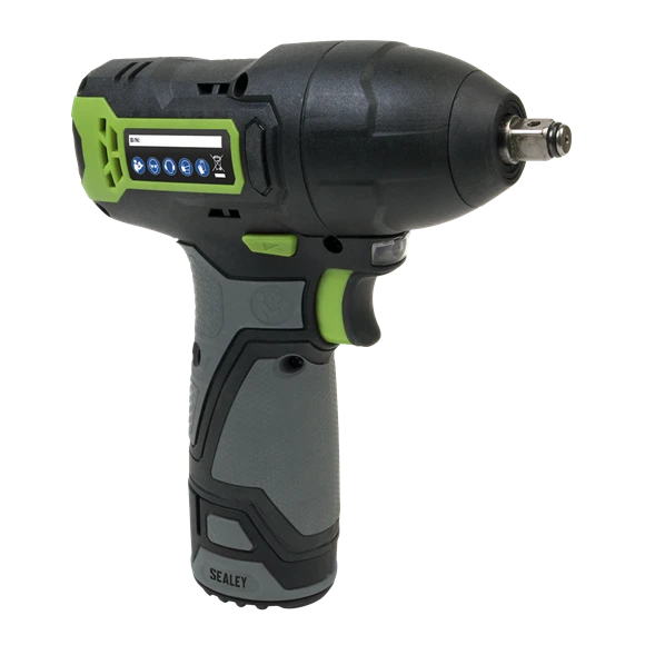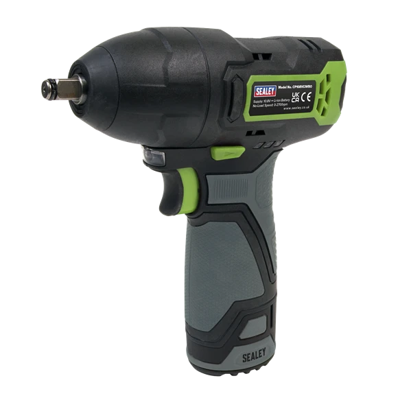 Compact, lightweight cordless impact wrench. Robust housing with soft grip to reduce vibration. Integrated LED battery level indicator and LED work light. Supplied with fast charge mains charger and 1 x 2Ah rechargeable Lithium-ion battery.