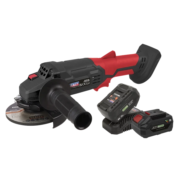 Part of the SV20 Series offering a one battery fits all solution, keeping costs down without compromising on performance. Superbly balanced, lightweight and compact design. Heavy-duty alloy bevel gear head with aluminium gear casing. Spindle lock for quick disc changes and adjustable disc guard. Supplied with side handle and soft grip for added comfort and control. Supplied with mains charger, two 4Ah batteries and a canvas storage bag.
