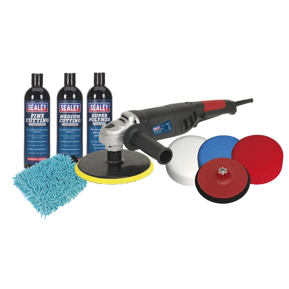 Package includes: • Model No. – • ER1700P – Ø180mm Lightweight Polisher 1100W. • SCS700 – 500ml Fine Cutting Compound. • SCS701 – 500ml Medium Cutting Compound. • SCS702 – 500ml Super Polymer Polish. • PTC/150VA/M14 – Ø148mm DA Backing Pad for Hook-and-Loop Discs M14 x 2mm. • PTCCHV150B – Ø150 x 50mm Hook-and-Loop Buffing & Polishing Foam Head Blue/Medium. • PTCCHV150W – Ø150 x 50mm Hook-and-Loop Buffing & Polishing Foam Head White/Dense. • PTCCHV150R – Ø150 x 50mm Hook-and-Loop Buffing & Polishing Foam Head Red/Ultra-Soft. • CC77 – 2-in-1 Shaggy Microfibre Mitt. • Model No. CPK05