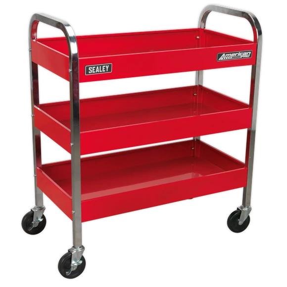 Garage or workshop trolley with a 50kg capacity per shelf. Deep-walled shelves, which may be installed base down or base up to give either tool and component security or unobstructed access. Fitted with four wheels, two fixed and two locking castors.