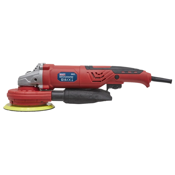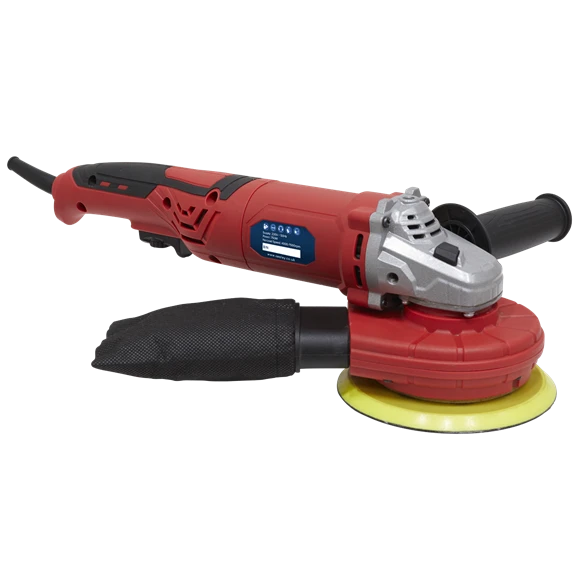Features variable speed control ranging from 4000-7000rpm. Rotating self-contained dust extraction port with dust collection bag. Alloy bevel gear head with composite motor housing. Supplied with Ø150mm hook-and-loop backing pad and side handle.