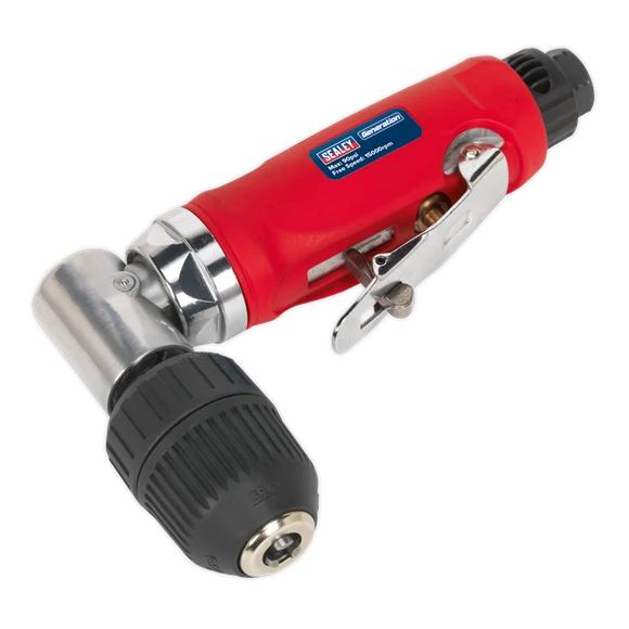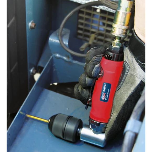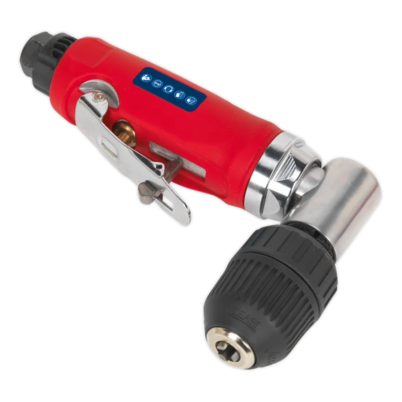Contoured composite handle reduces effects of chill on operator’s hands, provides added control and helps reduce vibration. 90° Angle is ideal for drilling in hard-to-reach areas. Directional, low noise air exhaust can be rotated 360° giving operator added protection. Fitted with safety trigger to prevent inadvertent operation. Supplied with Ø10mm Jacobs keyless chuck for fast bit changes.