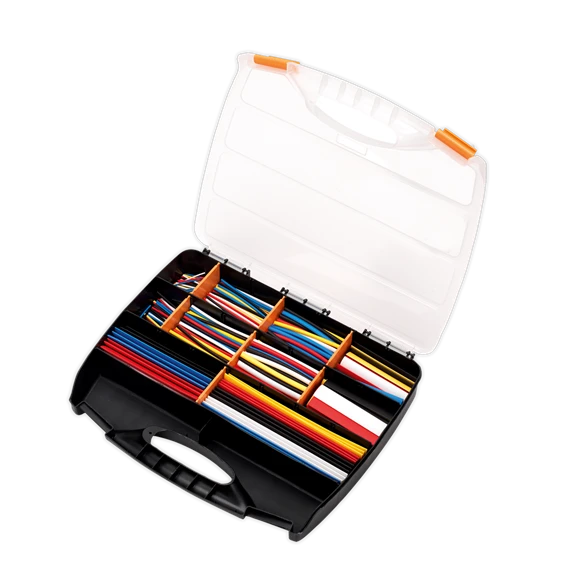 RoHS compliant heat shrink tubing. Various sizes from Ø1.2mm to Ø25.4mm. Shrink ratio 2:1 when heated to 90°C. Colour mixed assortment of Black, Blue, Red, White and Yellow. Supplied in partitioned box.