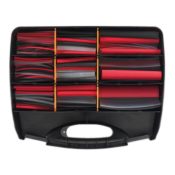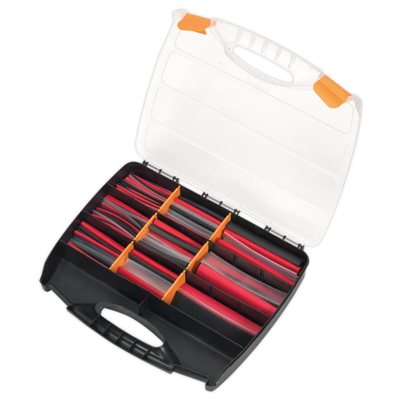 RoHS compliant heat shrink adhesive lined tubing. Various sizes from Ø2.4mm to Ø25.4mm. Shrink ratio 3:1 when heated to 100°C. Colour mixed assortment of black, red and clear. Supplied in partitioned box.