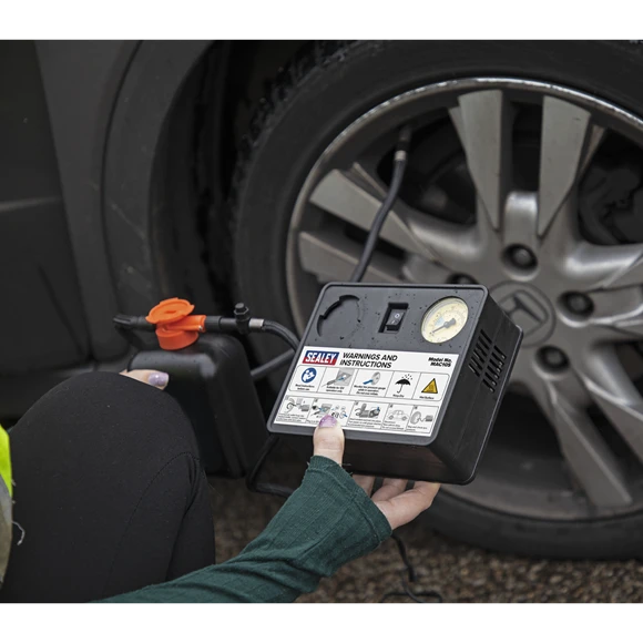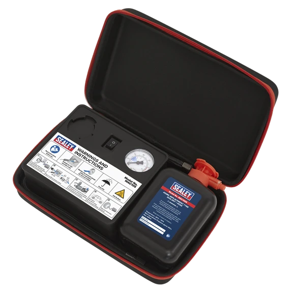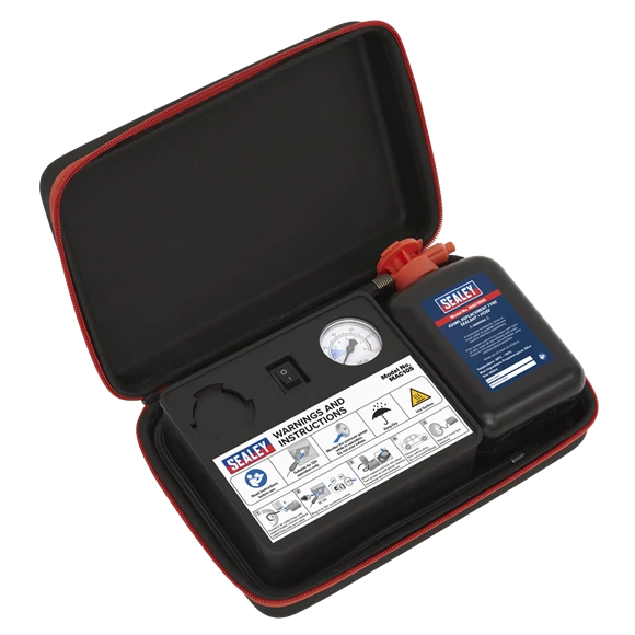 Emergency kit includes 12V compressor, 450ml sealant bottle, accessories for inflatables, instructions and zipped storage bag fitted with hook-and-loop fastening for smart storage. Can seal a puncture up to Ø6mm at the roadside in under 10 minutes. Sealant is manufactured from natural rubber, meaning tyre can be washed out at the point of a professional repair. Very simple-to-use kit requires no tools, no need to remove the valve core and is TPMS safe. Plugs into a 12V vehicle accessory socket. Replacement sealant bottle available – Sealey Model No. MAC10SR. Suitable for cars, vans and 4x4s.