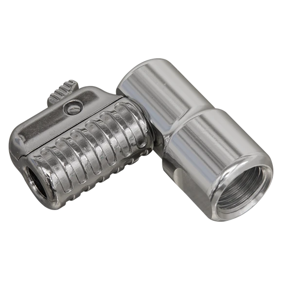 Quick release coupling design with 360° swivel motion, for tyre inflators, wall gauges and portable gauges. Simple but effective thumb push-button quick release. Suitable to replace the connector on any tyre inflator with a 1/4″BSP(M) connector. 90° Angled connector for the difficult to reach valves.