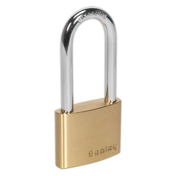 - Key operated padlock with corrosion resistant brass body and hardened steel long shackle.