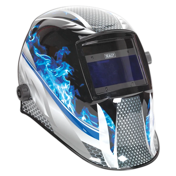 High quality infinitely variable shade 9-13 lens manufactured and tested to BS EN 379. Fully automatic switching from light to dark on striking arc. Features adjustable sensitivity and delay switches. Grinding function enables user to grind without removing mask. Deluxe contoured helmet approved to BS EN 175 which gives full neck protection and protects lens from scratching when helmet is laid down. Comfortable headband and non-slip quick release ratchet mechanism. Suitable for MIG, TIG, arc and gas welding.