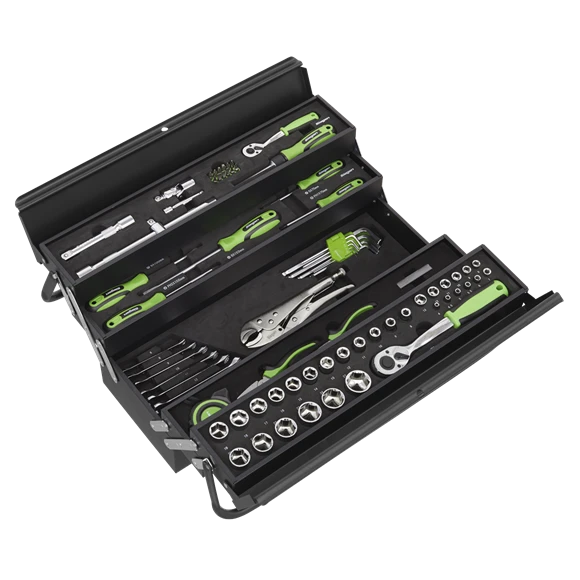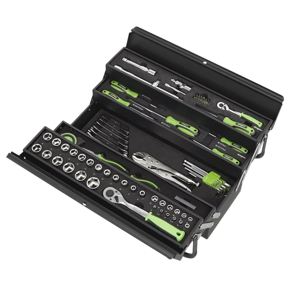 Comprehensive range of frequently used hand tools with 1/4″ and 1/2″Sq Drive Reversible ratchet wrenches. Includes 1/4″ and 1/2″Sq drive sockets, hex keys, combination spanners, screwdrivers, pliers, utility knife, measuring tape, bit set and accessories. Tools feature soft grip handles for comfort and control. Housed in a metal cantilever toolbox.