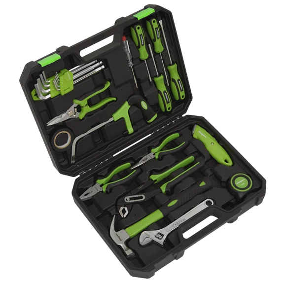 Kit includes slotted and Pozi screwdrivers with Chrome Vanadium steel shafts and soft grip handles. Combination pliers, long nose pliers and water pump pliers with soft grip handles. 8oz Claw hammer with fibreglass shaft. Junior hacksaw, universal shears and retractable snap-off knife. Ball-end hex key set and adjustable wrench. Mains tester, tape measure and insulating tape also included to make this comprehensive tool kit ideal for the serious DIY and professional user. Supplied in storage case.