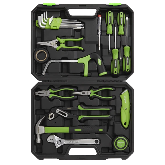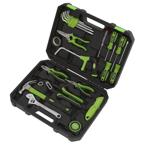 - Contents: Screwdrivers; Slotted – 4 x 100, 6 x 125mm, Pozi – #1 x 75, #2 x 100, 150mm Combination Pliers, 150mm Long Nose Pliers, 200mm Water Pump Pliers, 8oz Claw Hammer, Junior Hacksaw, Universal Shears, Retractable Knife, Ball-End Hex Keys – 1.5, 2, 2.5, 3, 4, 5, 6, 8, 10mm, Adjustable Wrench, Mains Tester, 3m Measuring Tape, Insulating Tape.