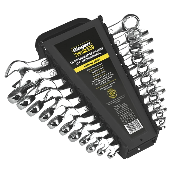 Manufactured from Chrome Vanadium steel. Fully polished heads. Made to DIN standard. Supplied in storage/carry rack.
