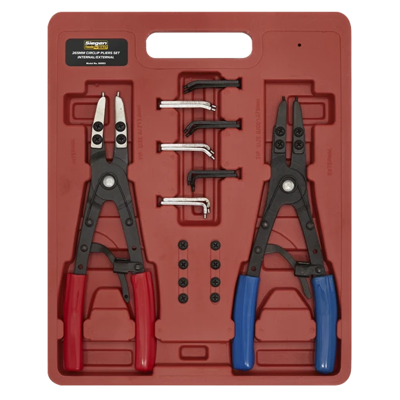 Internal and external circlip pliers with spring ratchet locking mechanism to securely hold against circlip tension. Includes eight pairs of tips, two sizes at various angles. Maximum spread 50mm. Fitted with chunky grip PVC handles. Supplied in storage case.