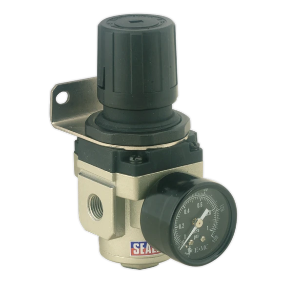 Suitable for workshop air supply set-ups. Features locking control knob for presetting air pressure and pressure gauge. Supplied with wall bracket.