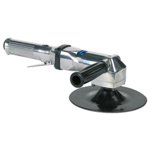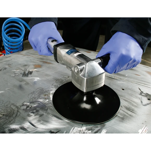 Polished and well balanced aluminium body with two side handle mounting positions. Precision made bevel gears give quiet and smooth operation at speeds suitable for sanding. Trigger operated throttle control. Supplied with Ø180mm self-adhesive backing pad.