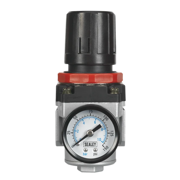 Suitable for workshop air supply set-ups. Features locking control knob for presetting air pressure and pressure gauge. Supplied with wall bracket.