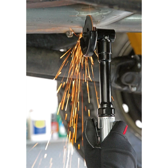 Extended reach cut-off tool is especially suitable for cutting off rear axle and exhaust tubes/brackets. Additionally suited to cutting off side frames or door sills. Fitted with metal safety guard and throttle safety device to prevent accidental operation. Cutting disc not included.