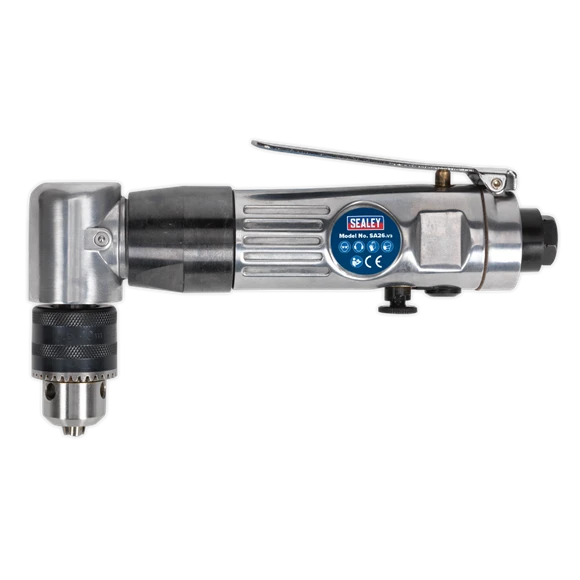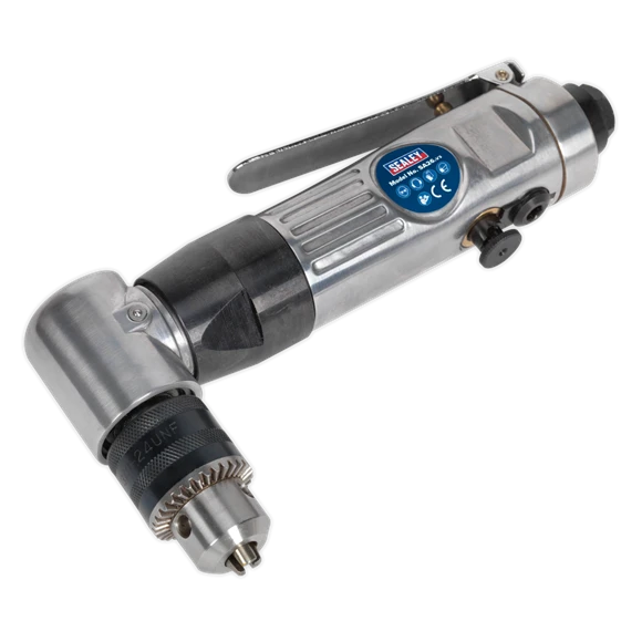 Right angle air drill with 90° planetary gearbox. Ideal for drilling in hard-to-reach areas where normal drills will not fit. Push-button reverse feature suitable for driving fixings. Supplied with Ø10mm chuck and key.