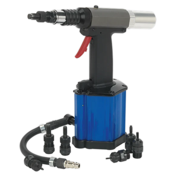 Heavy-duty, suitable for all types of nut rivets. Supplied with seven mandrels, two spanners and oil syringe. Trigger operated with automatic wind release for fast application. Will handle heavy assembly work.