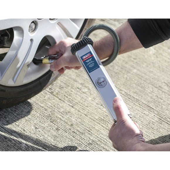 Heavy-duty extruded aluminium body and zinc head. Linear pressure scale, in psi and bar. Fitted with 0.5m rubber hose with steel protection sleeve and clip-on air connector. 1/4″BSP Inlet.