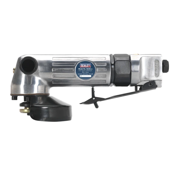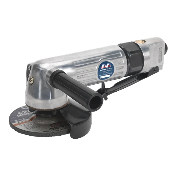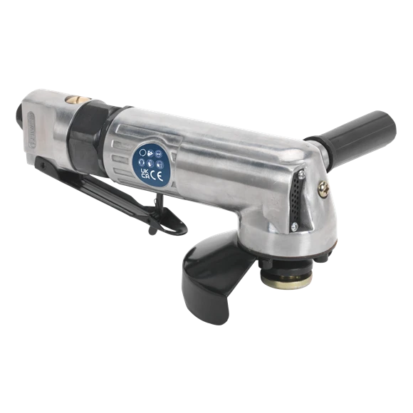 Aluminium body and bevel gear housing with steel disc guard and side handle. Fitted with throttle safety device to prevent accidental operation. Balanced and comfortable to operate. Suitable for general/heavy workshop use. Supplied with side handle and locking and pin spanners. Grinding disc not included.