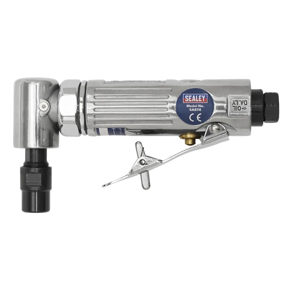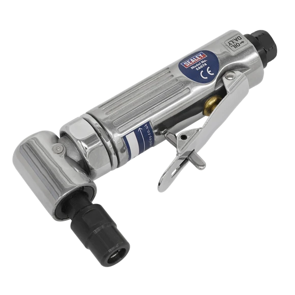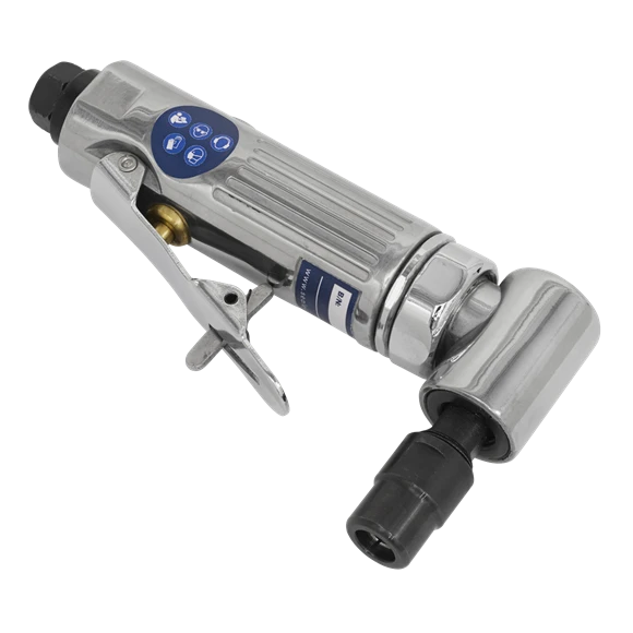 One-handed 90° angle die grinder with aluminium body and trigger with safety catch. Chuck accepts grinding points with Ø6mm shanks. Fitted with safety trigger to prevent inadvertent operation. Supplied with chuck spanners.