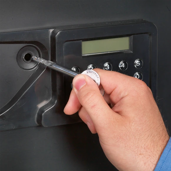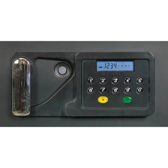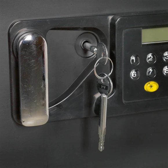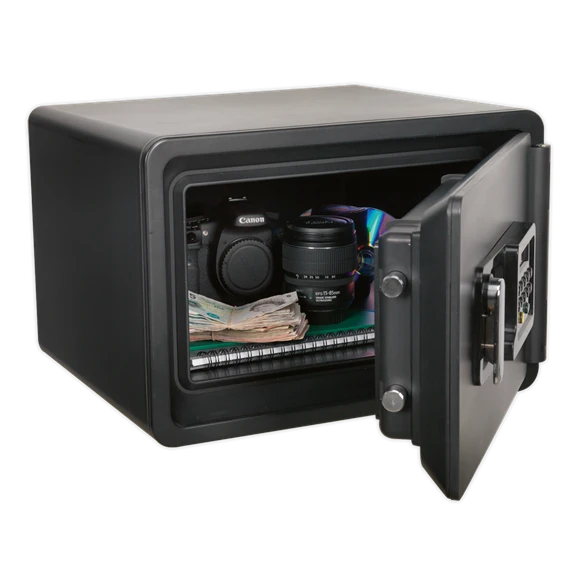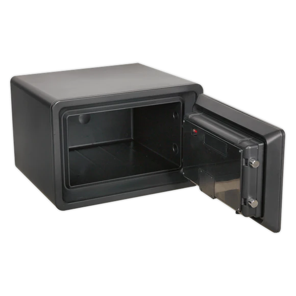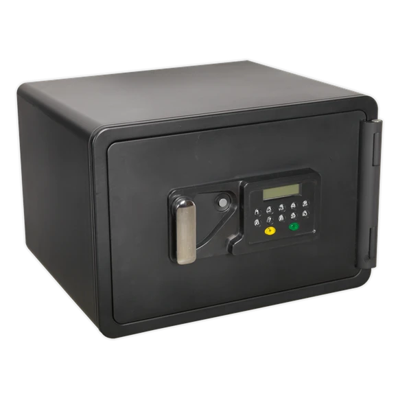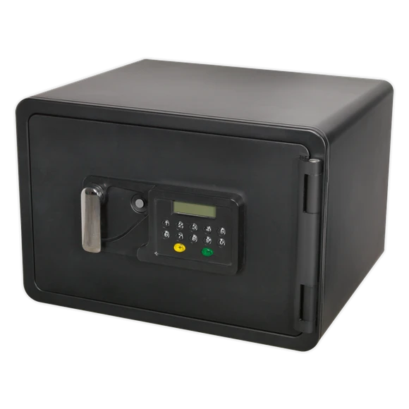 Heavy-duty ABS shell with a four bolt, door locking mechanism. Dual wall filled with cellular concrete. Electronic panel with LCD screen, accepts thousands of 6-digit codes. Also supplied with two emergency override keys. Offers up to one hour fire resistance with UL approval. Batteries not included.
