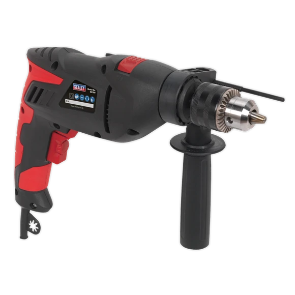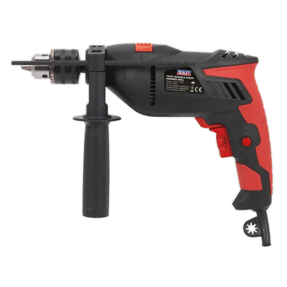 750W Hammer drill with variable speed and reverse controls. Suitable for driving and removing screws. Hammer action allows up to Ø13mm capacity in masonry. Features high quality Ø13mm chuck, textured grip handle and is supplied with adjustable side handle, 2m cable and 3-pin plug.
