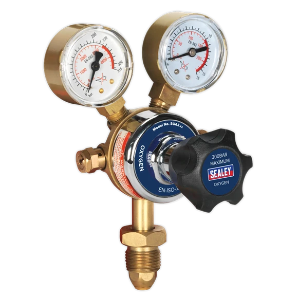 Twin gauge regulator to BS EN ISO 2503 with bull nose adaptor and 3/8″BSP hose union. Displays bottle pressure and working pressure for oxygen.