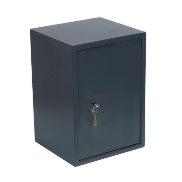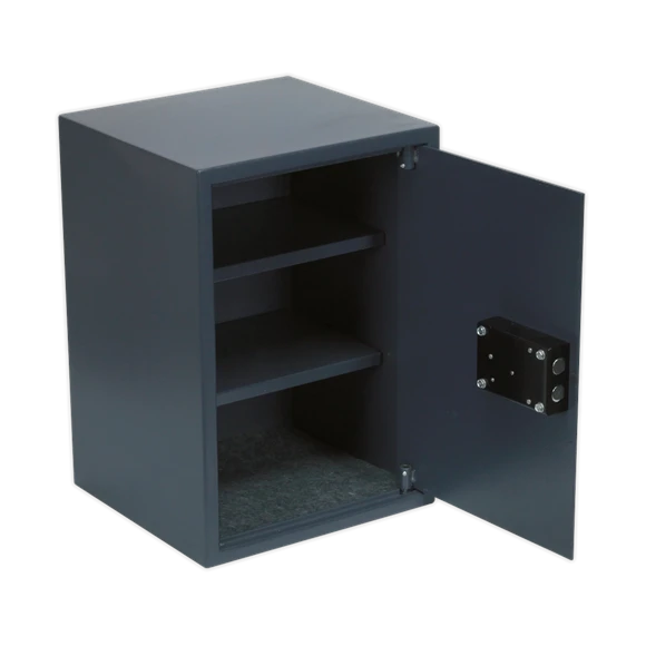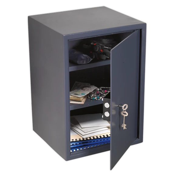 Heavy-duty steel construction with twin locking bolts. Powder coated finish to help prevent corrosion. Compact design, pre-drilled holes and security fixings allow safe to be fixed to the floor or to the wall and hidden away discreetly. Includes two shelves to help utilize the area inside the safe. Supplied with two keys.
