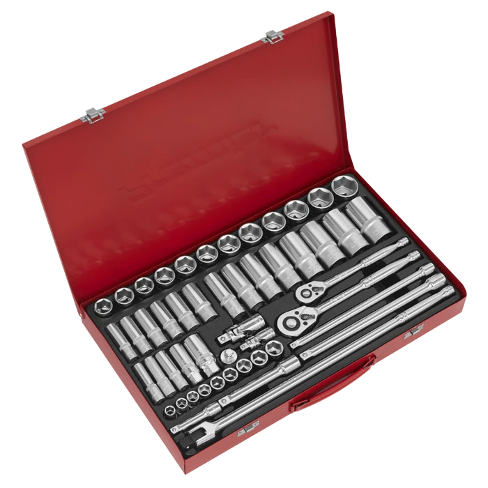 Deluxe professional socket set with heat treated Chrome Vanadium steel WallDrive® sockets. Dual satin/chrome finish. 48-Tooth gear-to-gear quick release ratchet. Supplied in metal storage case.