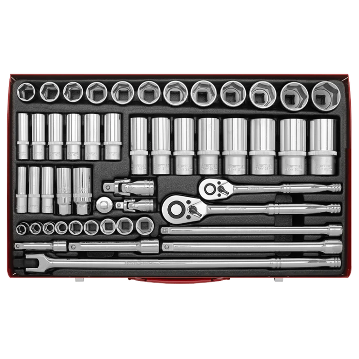 | Contents: | 3/8″Sq Drive Sockets; 10, 11, 12, 13, 14, 15, 16, 17, 18mm, 3/8″Sq Drive Deep Sockets; 10, 11, 12, 13, 14, 15, 16, 17, 18mm, 1/2″Sq Drive Sockets; 19, 20, 21, 22, 23, 24, 25, 26, 27, 28, 30, 32mm, 1/2″Sq Drive Deep Sockets; 19, 21, 22, 24, 27, 28, 30, 32mm, 3/8″Sq Drive Spark Plug Sockets; 16, 21mm, 3/8″Sq Drive Accessories; 48-Tooth Gear-to-Gear Quick Release Ratchet Wrench, UJ, Extension Bars; 75, 250mm, 1/2″Sq Drive Accessories; 48-Tooth Gear-to-Gear Quick Release Ratchet Wrench, 450mm Breaker Bar, UJ, Extension Bars; 125, 250mm, 1/2″Sq Drive – 3/8″Sq Drive Male Adaptor |