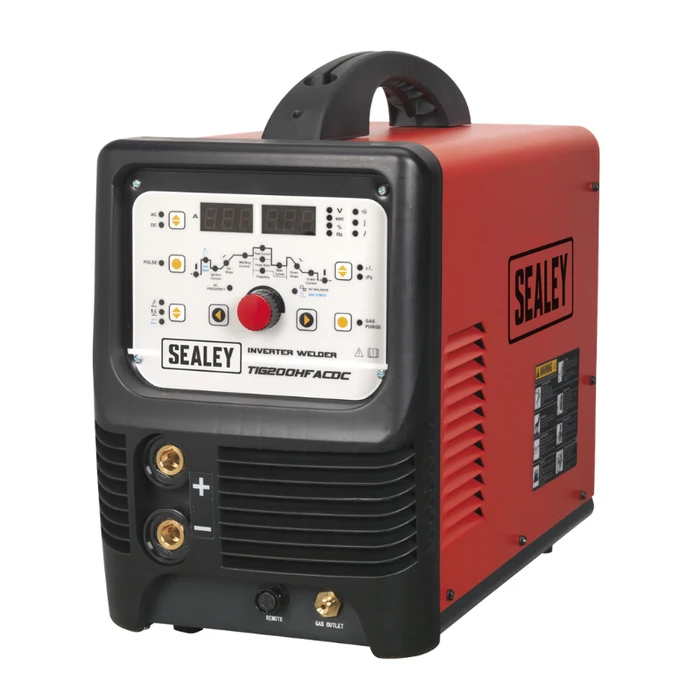 Fan-cooled AC/DC power supply for pulse TIG and MMA welding applications. Suitable for welding aluminium, magnesium, stainless steel, steel, copper, nickel and titanium. TIG cycle includes post gas and current down-slope regulation. Features regulated high frequency (HF) push-button arc that prevents having to touch the workpiece to start, keeping the tip in good condition for longer. Includes connector for foot pedal when more control is required. Foot pedal available as an optional accessory (Model No. TIG200HFACDCF).